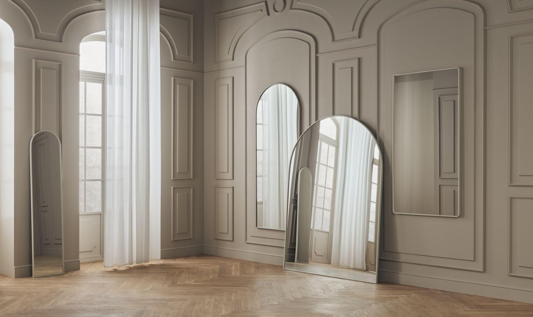 Ripple is a series of beautiful mirrors with an architectural gaze. Each mirror is inspired by the semi-circular arched windows that suited the Romanesque era. A subtle imitation with an elegant modern touch. The mirrors are designed to work as independent standalone pieces and as a creative row of reflecting mirrors. Made from elegant and durable materials, Ripple will dress your interior for years to come.