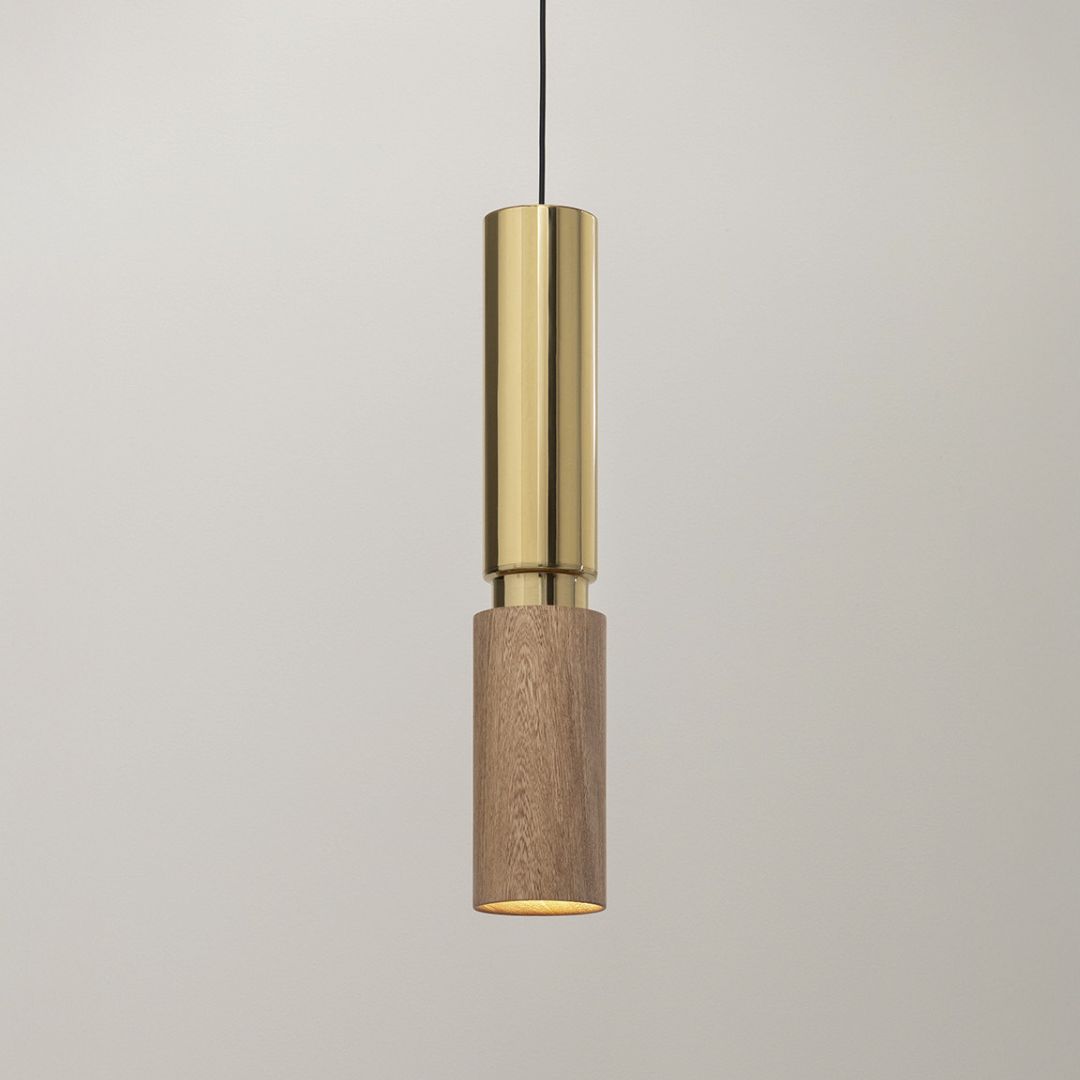 A pendant lamp designed for versatility, showcasing an interplay of six sophisticated finishes. Each combination explores unique material sensations, highlighting the timeless beauty of saman and oak wood elegantly contrasted with brass, nickel, and white powder-coated metal.