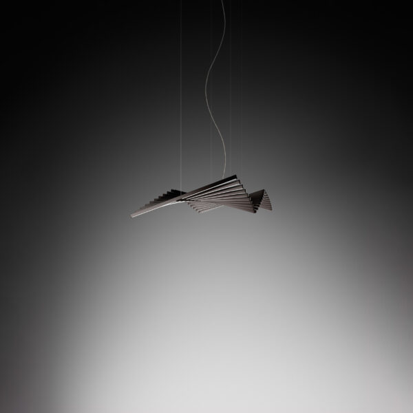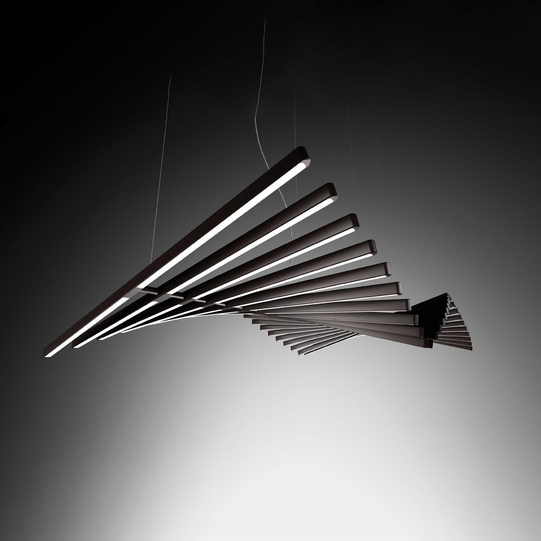 The Rhythm pendant light offers downward illumination and can be installed as either a surface-mounted or built-in fixture. Available in two finishes—matt lacquered off-white and matt lacquered dark brown—each light stick features an integrated LED source. Ideal for reception areas and restaurants, the Rhythm pendant provides both style and functionality.
