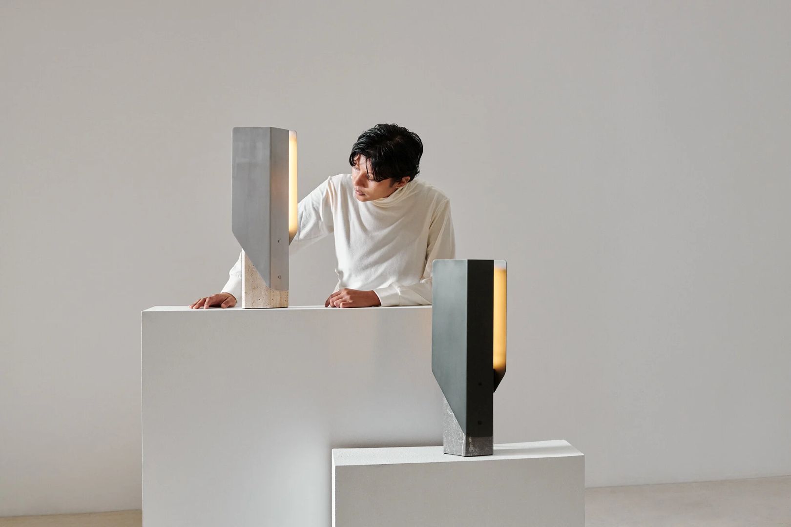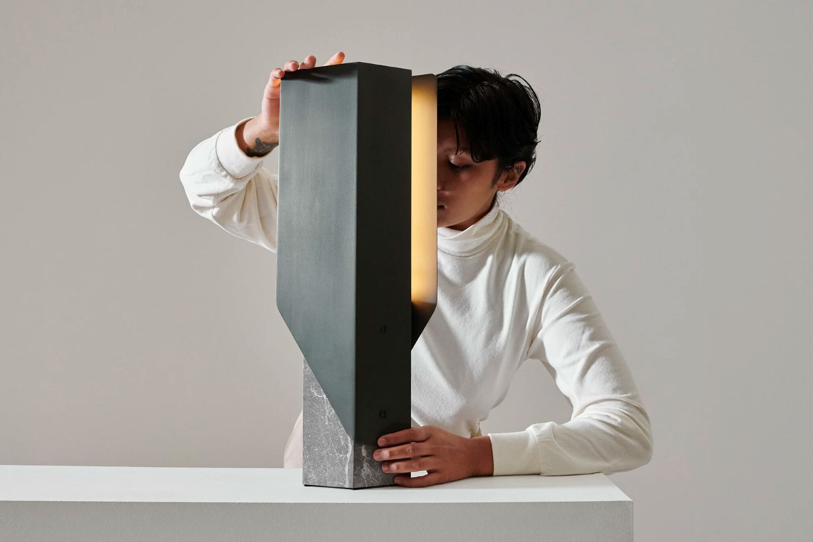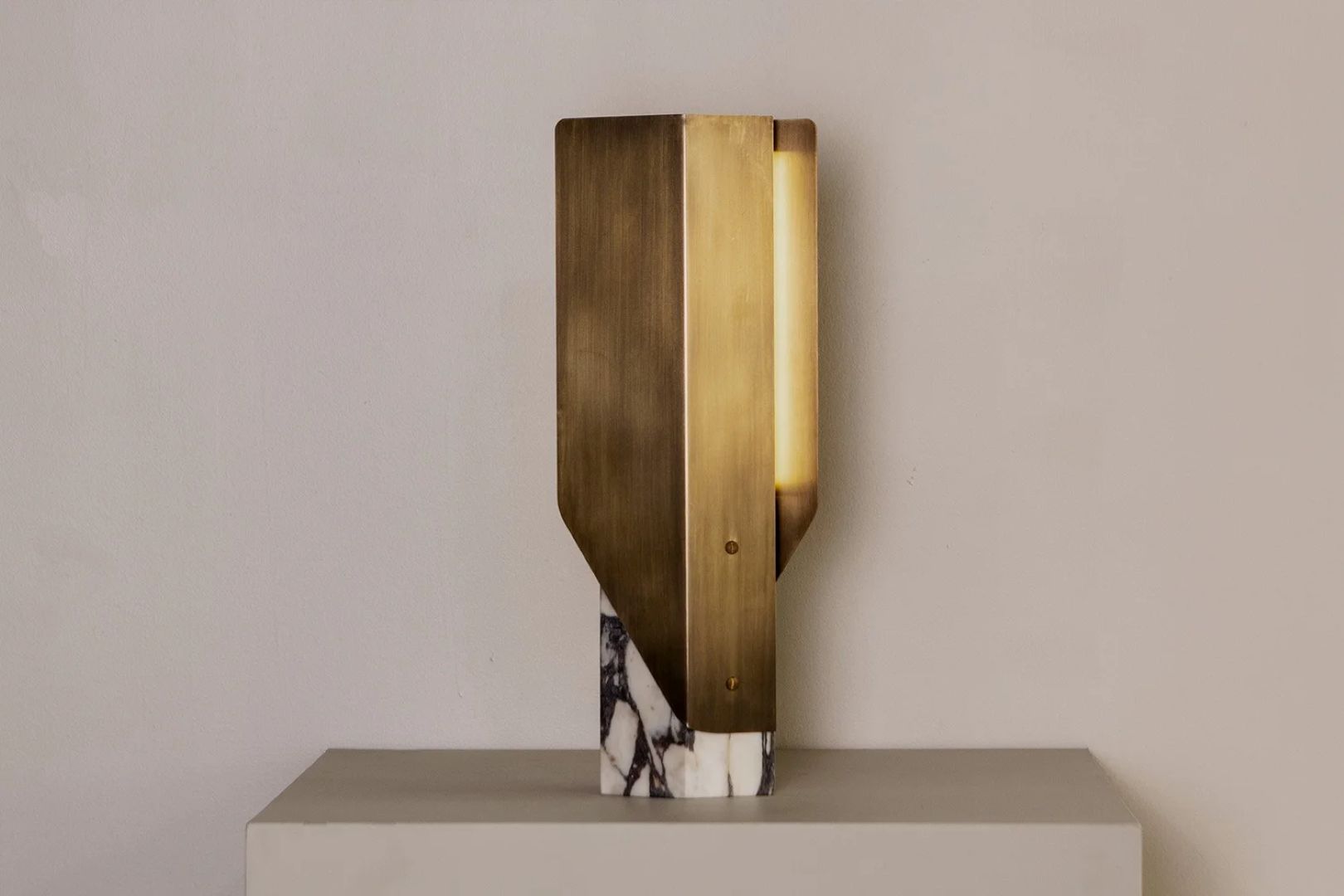 Two editions of the Fold Table Lamp are available. The first matches a solid block of grey marble with an anodised ‘Deep Sea’ aluminium finish. The second features a base of raw travertine and a brushed aluminium finish.