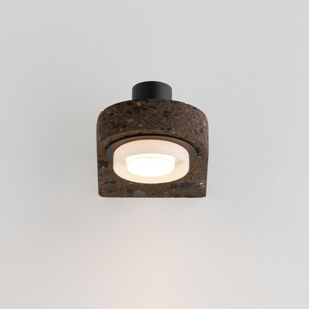 The new series of light sculptures named “Ambra Toba” combines volumes of ancient stones and aluminium. Centerpiece is the Mexican “Toba volcánica” stone that consists of minerals, glass and volcanic debris ejected one million years ago during severe eruptions. Fragments in the geometrical surfaces are testament to these explosions and movement. The contrast between porous textures and smooth dark red underlines the studios contemporary approach on traditional materials and craft. The connecting components between the sculptural stone elements and the aluminium parts originate from an intensive research of linking unique handmade shapes with industrial parts.