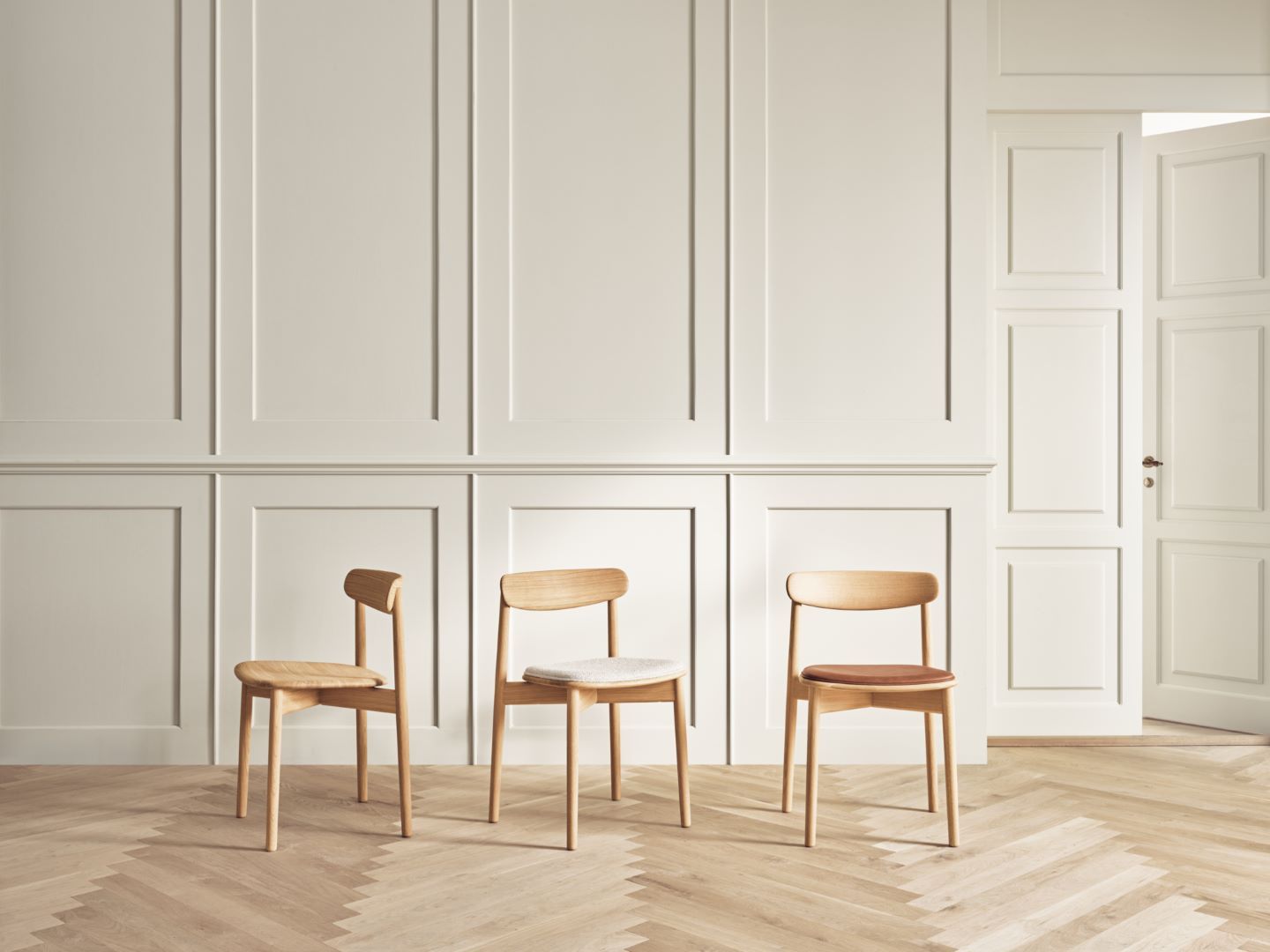 Smooth and rounded volumes enhance the natural qualities of oak and make the chair a warm and welcoming presence in any dining room. The padded seat can be upholstered in fabric or leathers of your choice, and the seat pad can be replaced if needed, securing a long lifetime.
