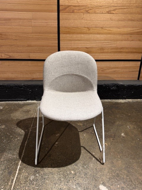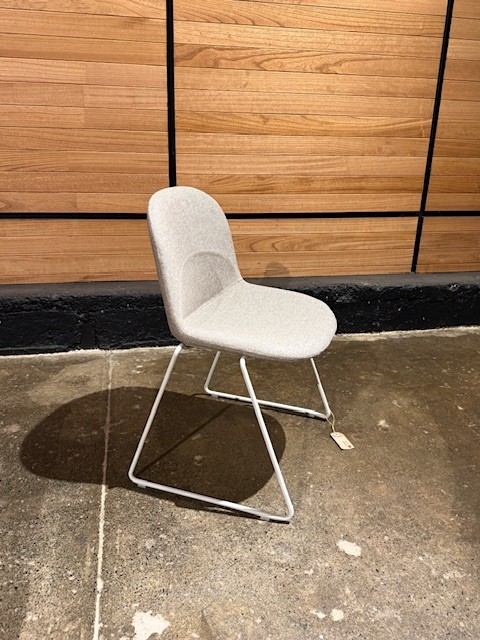The Lunar Chair offers flexibility and versatility for various environments. It features soft curvaceous lines, an arcing lumber scoop, and a White Orbiter Base with gliders. Upholstered in Camira Mainline Flax Archway (Beige) upholstery.