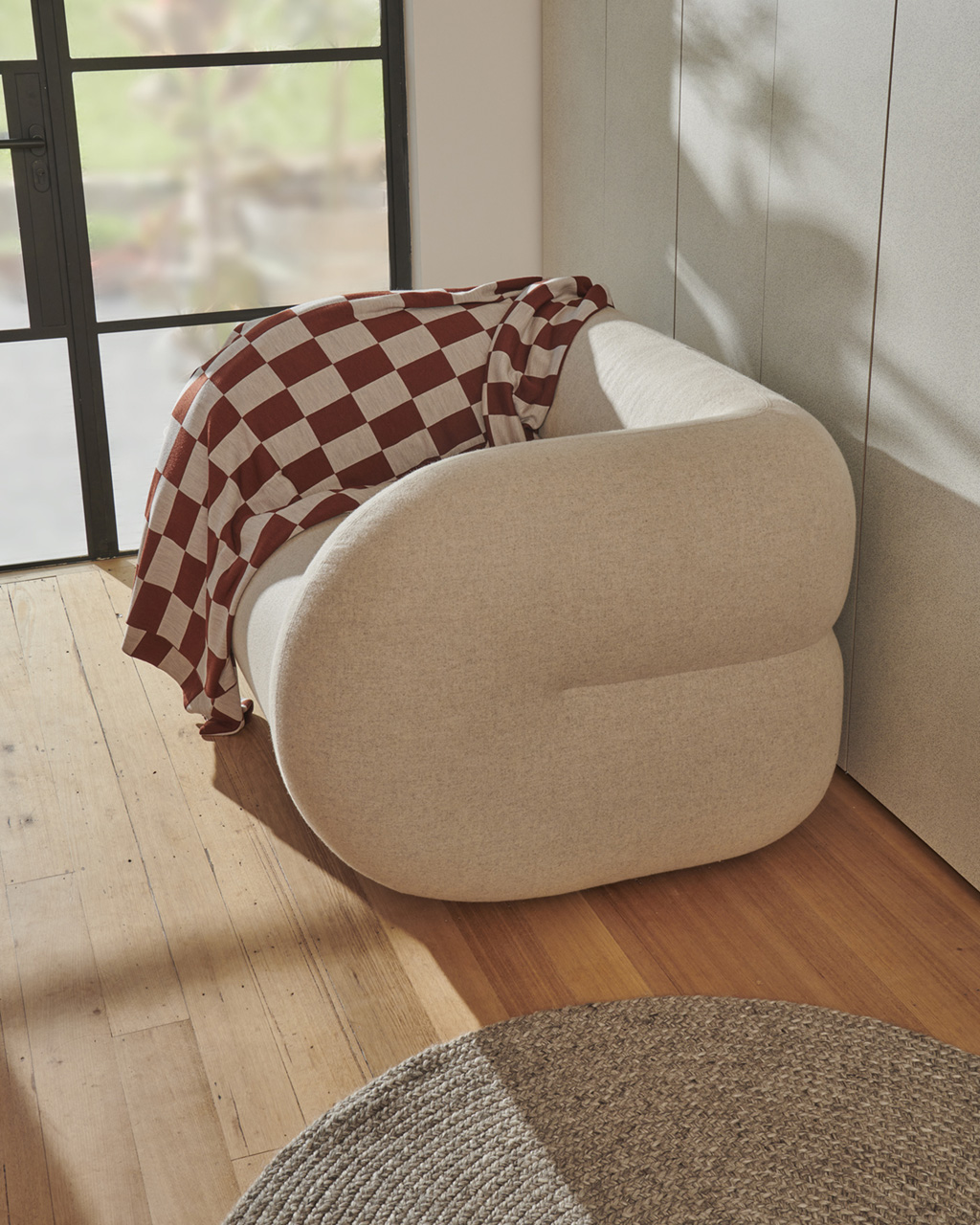 The Big Friendly Chair, designed by CJ Anderson, is a playful and bold piece that invites users to take a seat. Anderson’s design language embraces comic playfulness, as seen in the exaggerated proportions of the arms and backrests. The chair features an exposed seam line running down the back, breaking the form into distinct sections and adding visual interest.