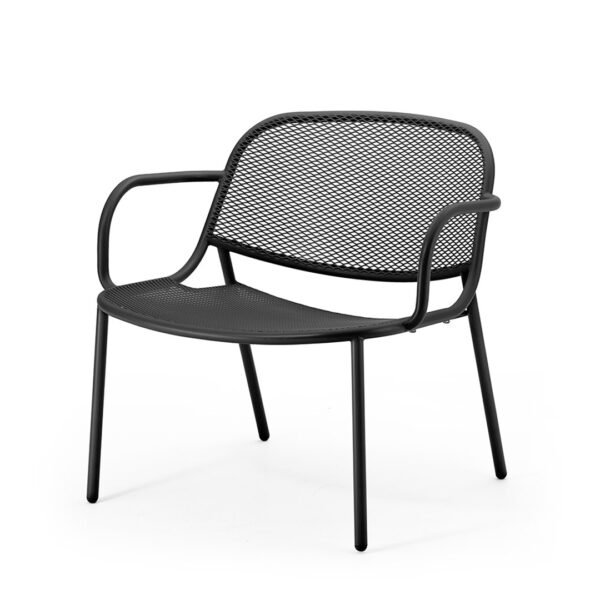 The Grille Outdoors/In Relax Low Lounger, designed by Marcel Sigel, offers superior comfort with its innovative 3D bent tubular design and expanded mesh seat and backrest. Suitable for indoor and outdoor use, it features a stylish Matt Black finish.