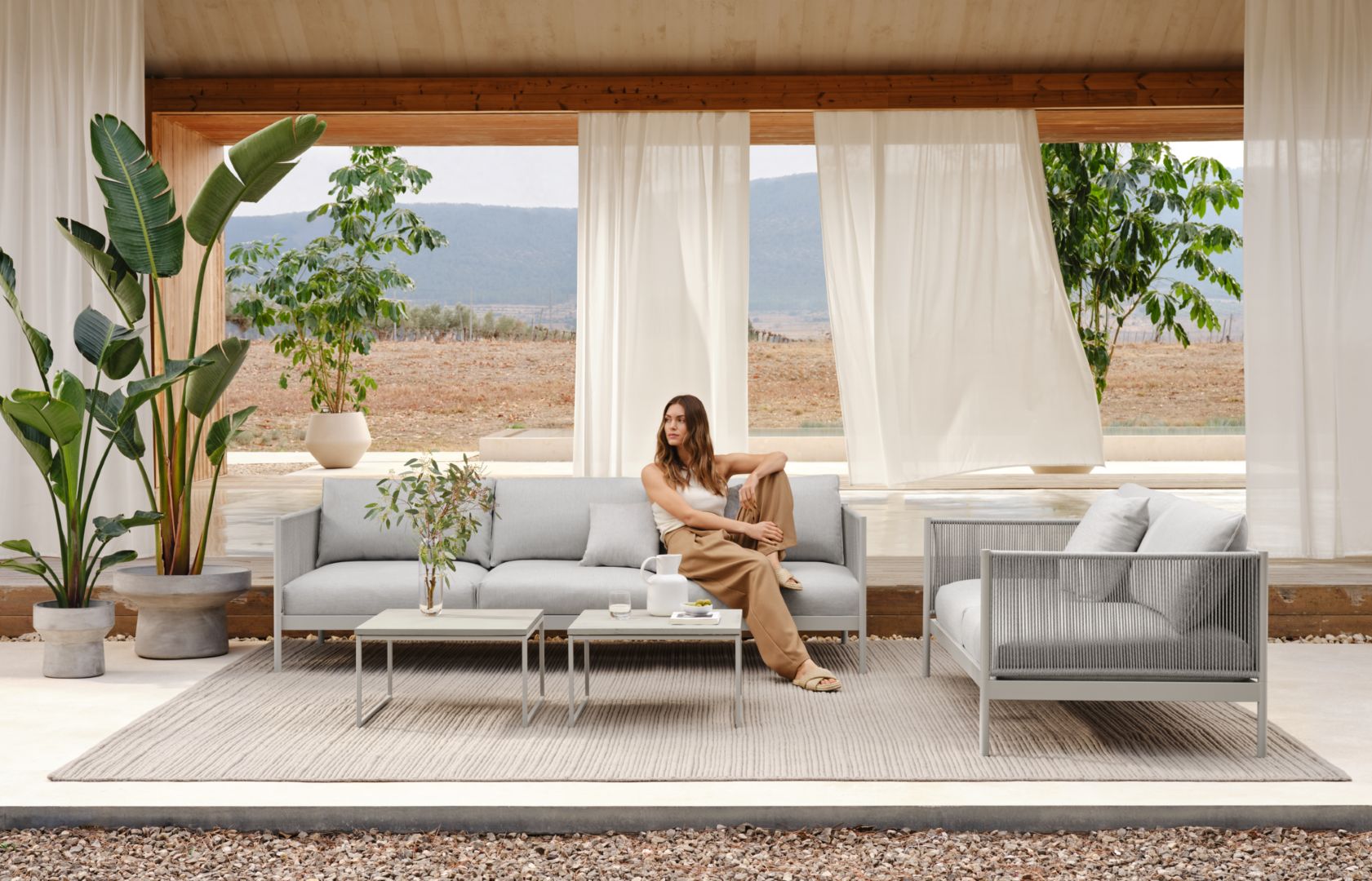 A refined feature of the design are the armrests, elegantly handwoven with a cord – covering the metal which can feel cold or hot to the touch while adding a light and airy feel that creates beautiful shadows in the sunlight. All fabric covers are removable with zippers, allowing you to freshen up your sofa as often as you wish to, and all cushions are made of durable outdoor materials and can be easily stored away during winter.