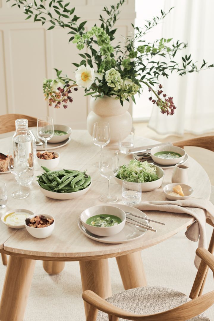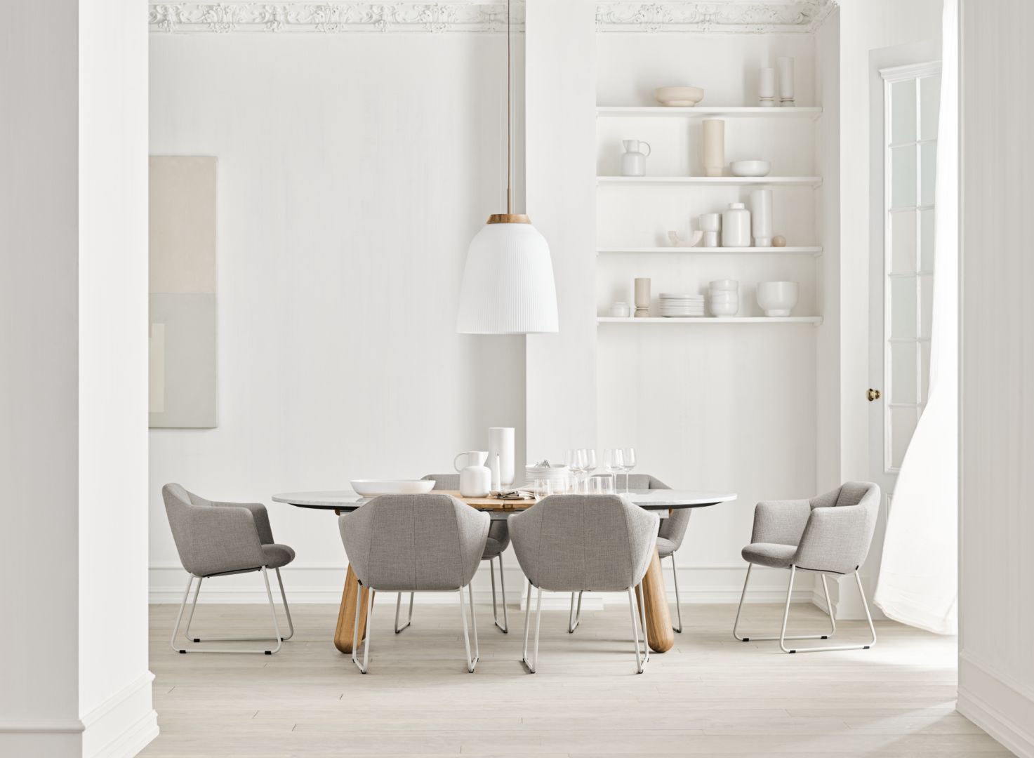 The Balance dining table, designed by Michael H. Nielsen, unites bold lines and design language with elegant and natural materials. The strong legs in FSC™ certified oak function as a solid foundation for the luxurious stone tabletop, which is broken up by the solid oak extension leaves when extended. A striking dining table with refined proportions and details.