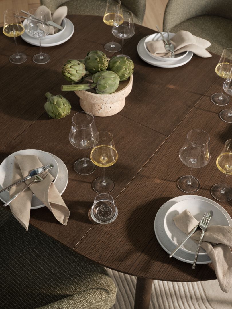 Through crafted details and simple, rounded lines, the Ronya table elevates the dining experience to its most warm and inviting form. Studio Nooi have created a cleverly designed extension table, featuring a unique, built-in butterfly mechanism that elegantly extends the table in two simple movements. Allowing the tabletop to remain a full, unbroken surface when not extended. With legs crafted in solid FSC™ certified oak and tabletop in beautiful oak veneer or laminate in a selection of colours, the table is tailormade to meet all your dining needs.